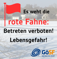 Das Team GöSF kontrolliert in diesen Tagen täglich die Eisdicke auf dem Kiessee. Noch ist das Betreten der Eisfläche untersagt, die rote Fahne weht! Die tragfähige Eisschicht – das sogenannte Kerneis – betrug am 08.01.26 lediglich vier Zentimeter. Besucher:innen sollten unbedingt offizielle Freigaben abwarten. Solange die rote Fahne weht besteht Lebensgefahr beim Betreten des Eises. Das gilt auch während des Wochenendes 10./11.01.26.